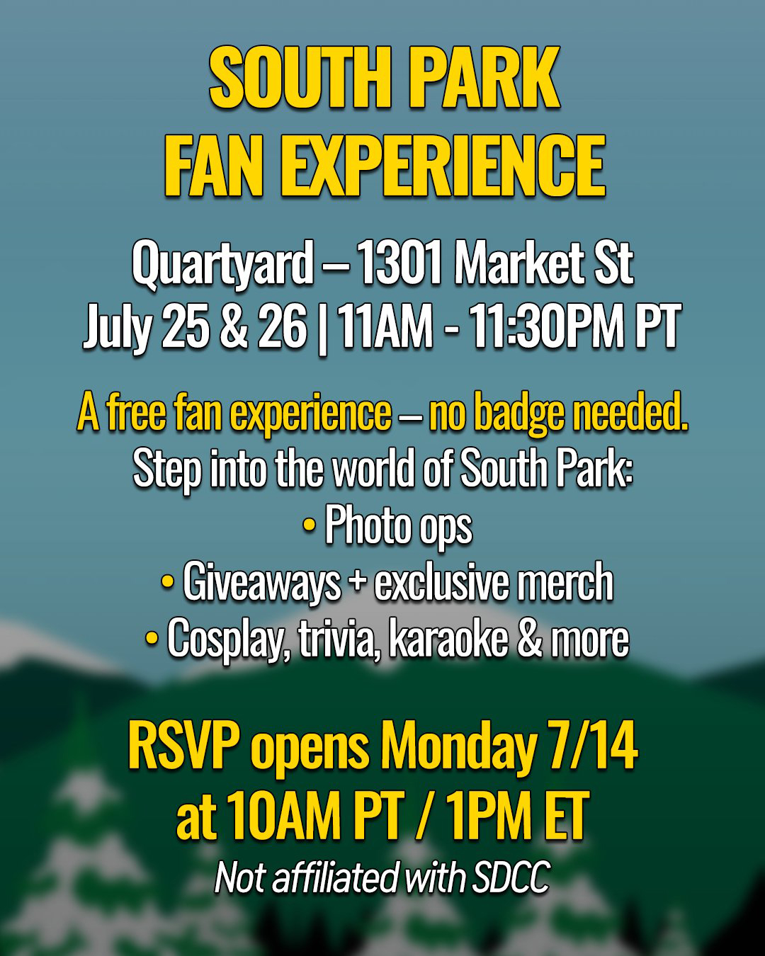 In addition to the panel, fans will have the opportunity to step into the world of South Park at an immersive activation at Quartyard, 1301 Market St, San Diego, CA 92101. The experience will feature interactive photo moments, giveaways, exclusive merch, cosplay contests, trivia, karaoke, and more — bringing the beloved franchise to life like never before.