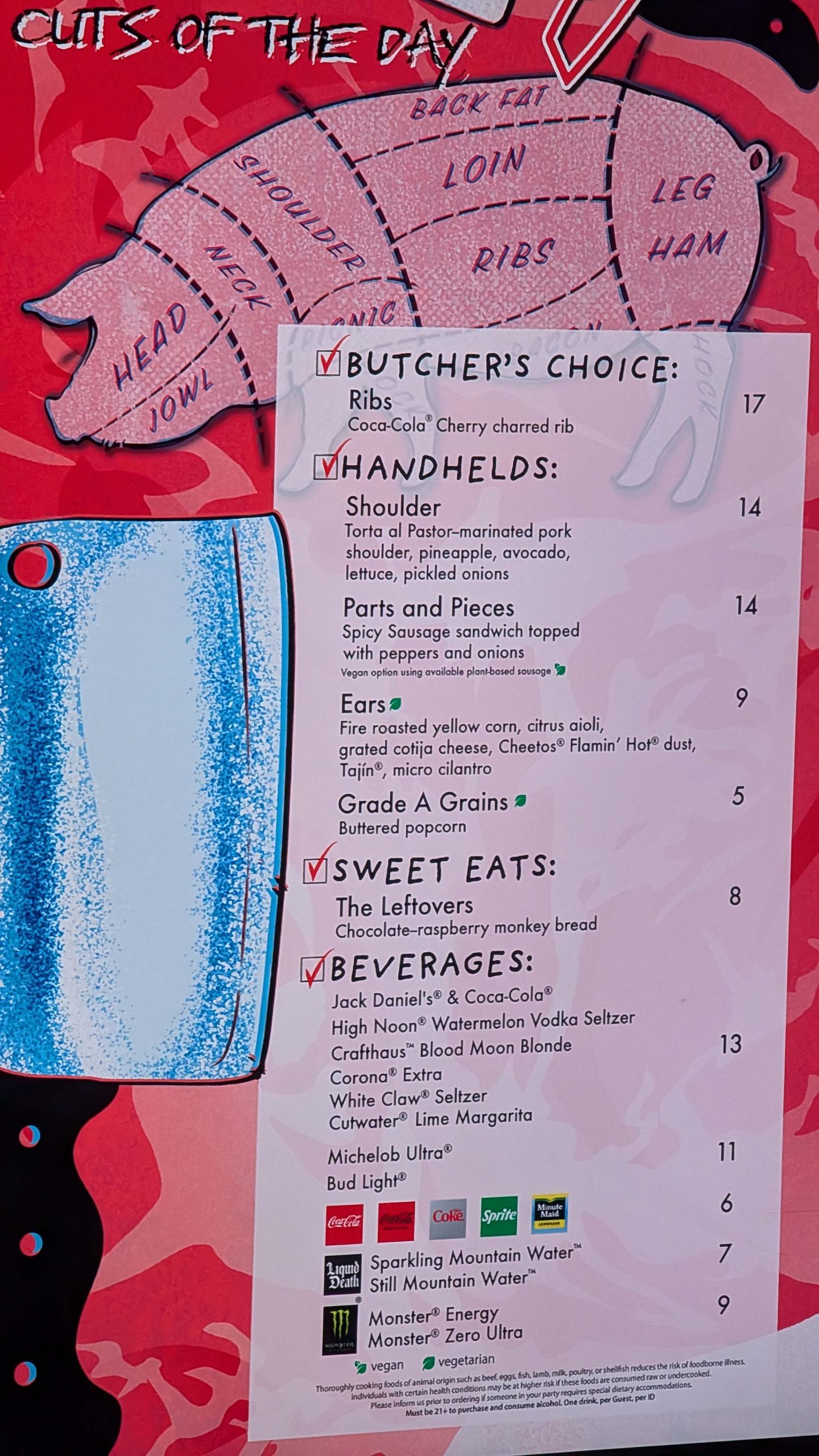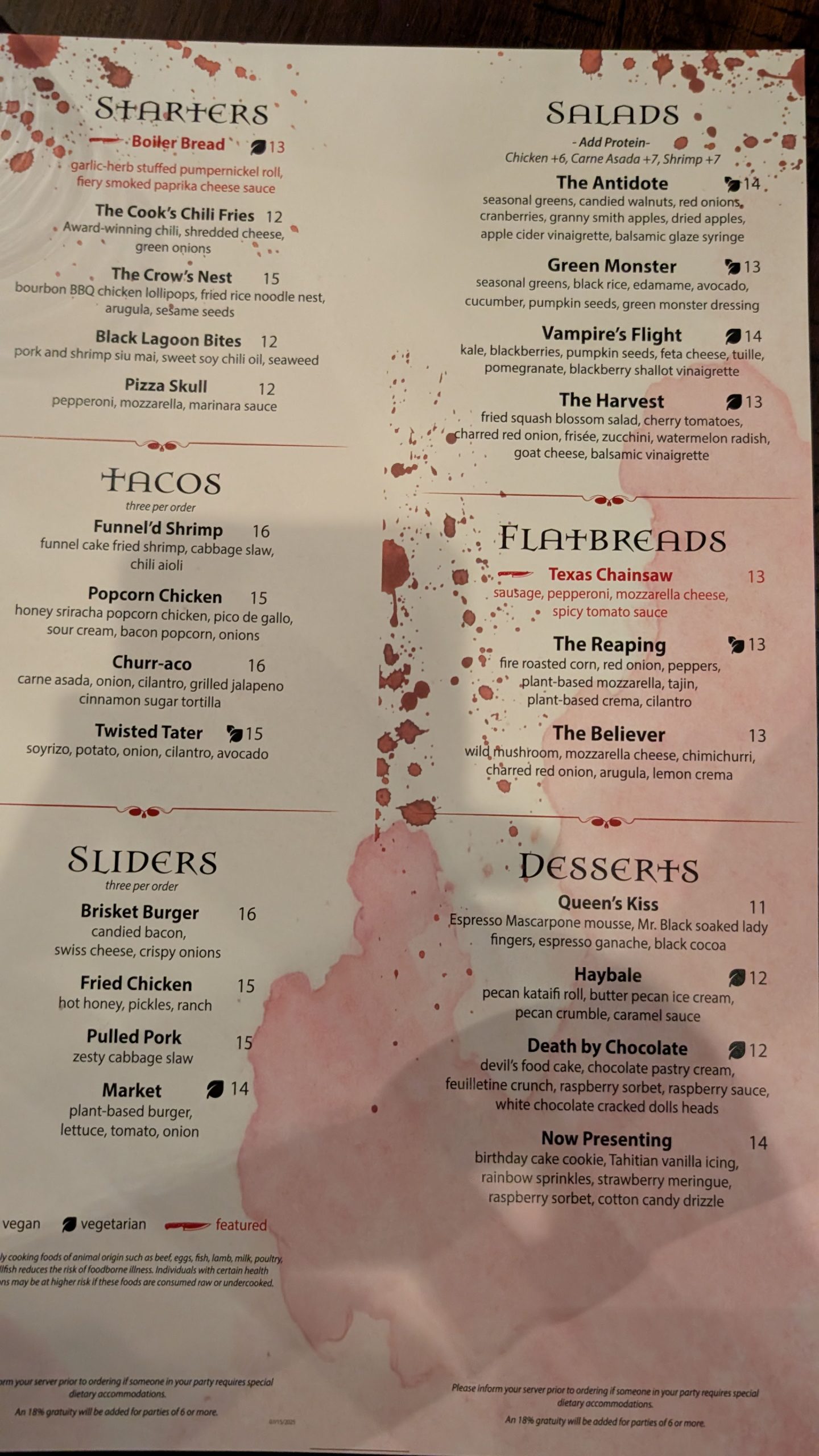 That all means, it was time to wander about Universal Horror Unleashed toward the four different bars and restaurants in the building. We had The Boiler, which is the main centerpiece of it all, with a signature cocktail. Rough Cuts, was more of a quick snack and bite area with a butcher shop theme. Jack’s Alley, which not only serves as a main bar but also the place where the main show from Jack & Chance starts. Then, finally, The Premier, which was more of a sit-down location for food and drinks in Horror Unleashed, with the theming all around the various Blumhouse films that are out there. Mostly just little photo ops for The Purge, Black Phone, and M3GAN. A fun little dance was taking place from someone dressed up like M3GAN that happened at various intervals. While we did partake in the food after hitting all of the haunts, I am going to dig in now on all of that. This is one of the big draws to the place, and a little harder to showcase in video as we have with the Jack & Chance Show and the other performances that went down in the building. Especially, since it felt like we were being hit with Vegas Strip prices while off The Strip…