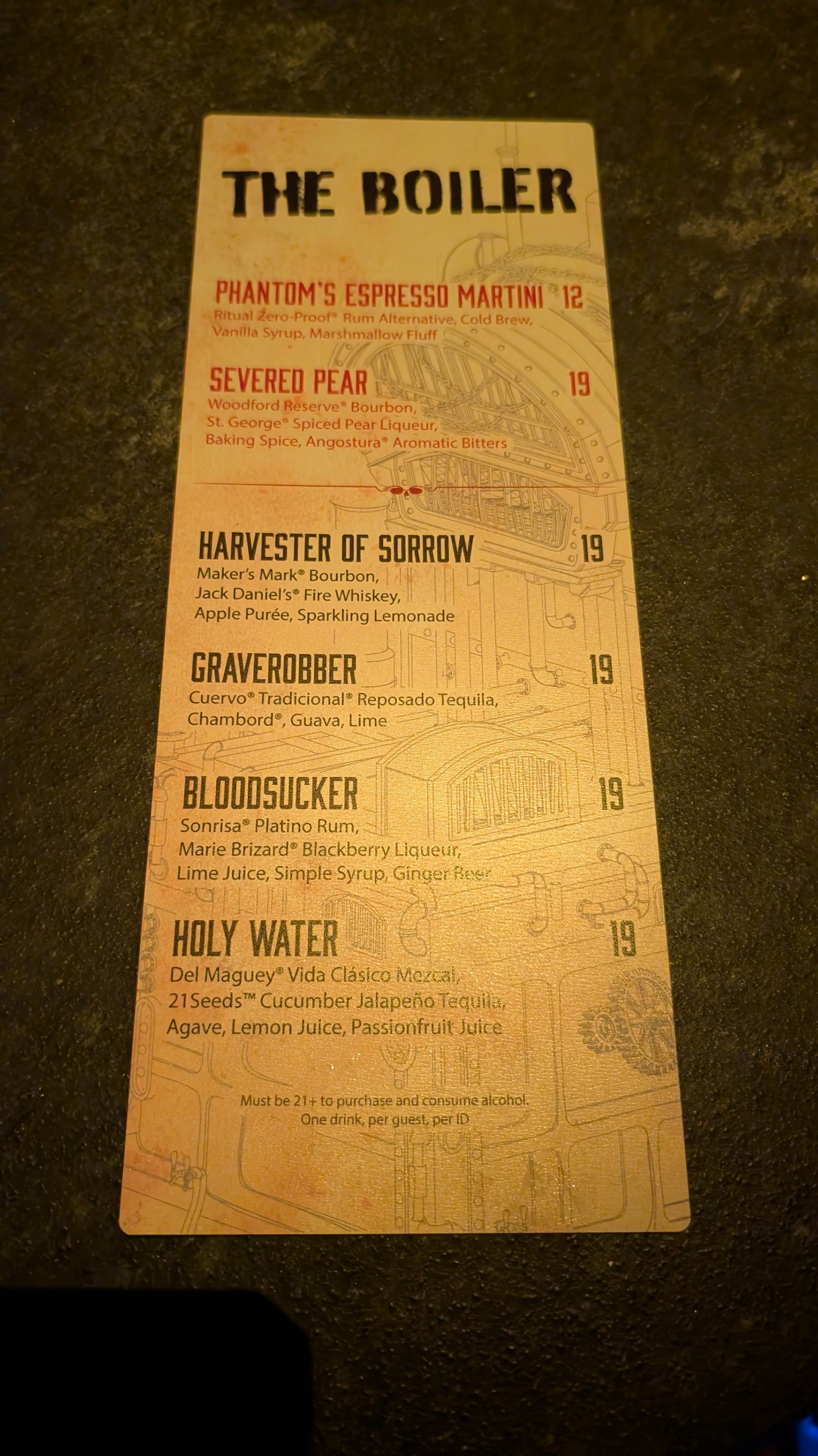 Yes, you should not expect to see any of the “locals'” pricing at Universal Horror Unleashed when it comes to the food and drink. Something that was a little expected before going in and dealing with Area 15 in the same way. Not to mention, just as it is out at Universal Studios in general, they have a captive audience. That is, you are not allowed re-entry, and if you are hungry or thirsty, you are stuck. Not terrible, just something to plan on. That, or plan to have something to eat before coming in, as the food was mostly bland and barely worth the cost of it all. The flatbread pizza, to me, tasted like something I would have had in a high school cafeteria. The chicken lollipops were good, as was the pizza skull, but so small that the following pictures are not the best to highlight that. Especially for the cost of it all. Then we have the drinks. This is where I will say things began to taste better, but the presentation of them all left little to be desired. Especially after seeing that the food was given that treatment, but all of the drinks I had out at Horror Unleashed looked just like anything I could have picked up in a general bar. Outside of the signature cocktail at The Boiler, but that was still the same, just with the chance to have a good photo op with some props and nothing else. Given that we used to have a smaller cafe in town built around a similar experience, that was where the bar was set, and Universal did not even compete with the theming and presentation of a small mom and pop level bar. Feels like this needs to be beefed up if you are still going to charge the high prices.